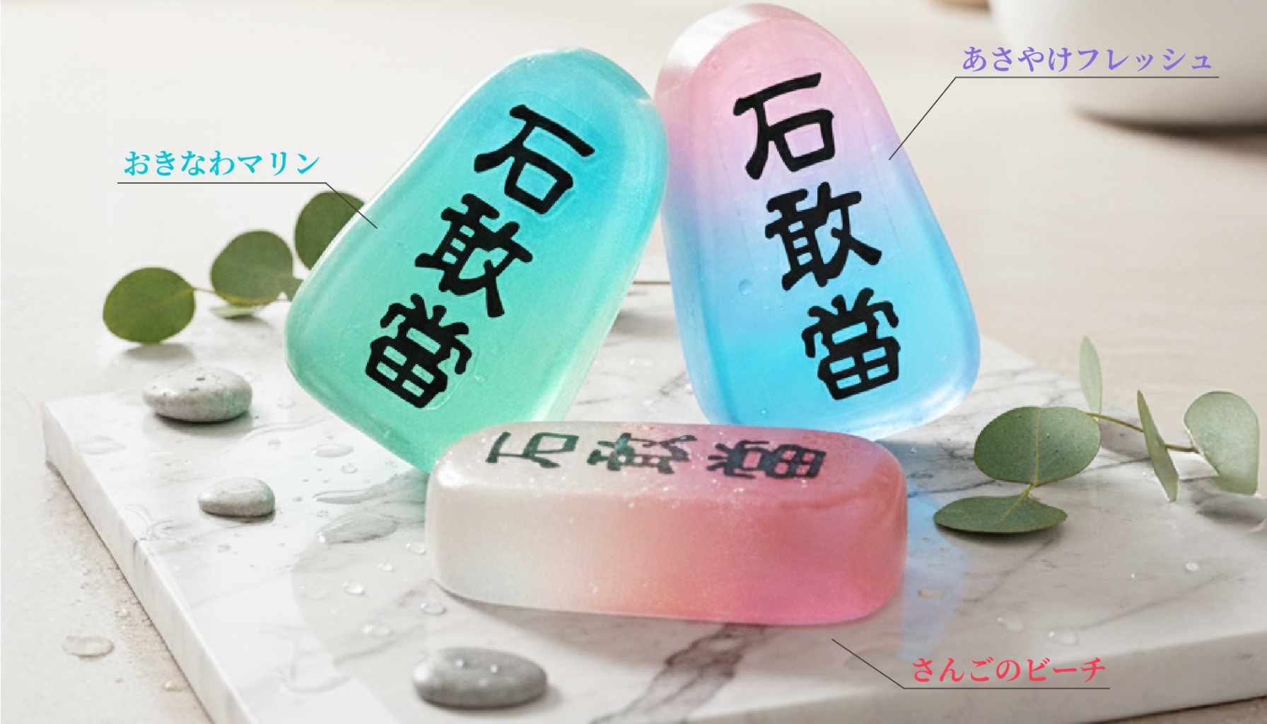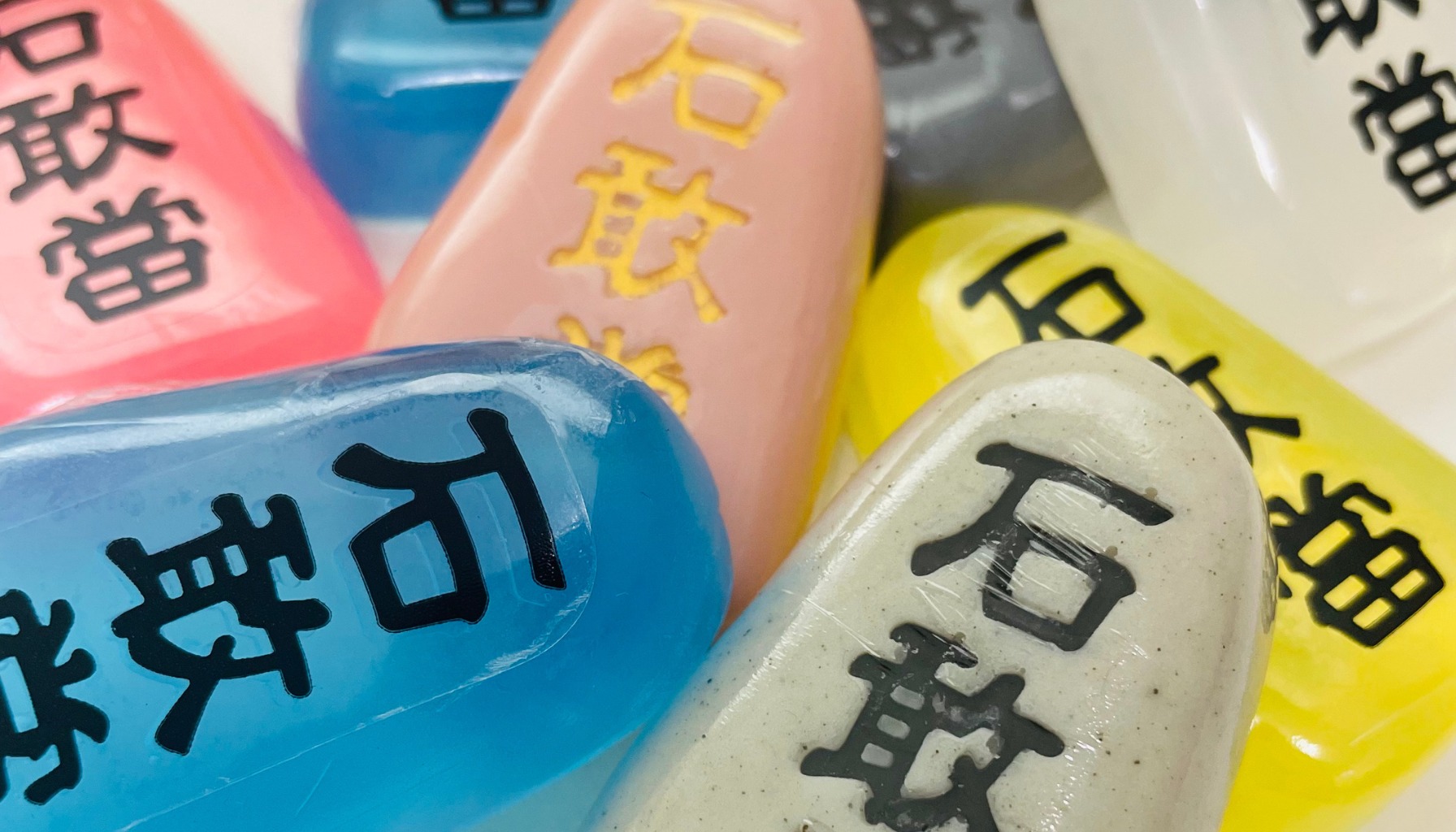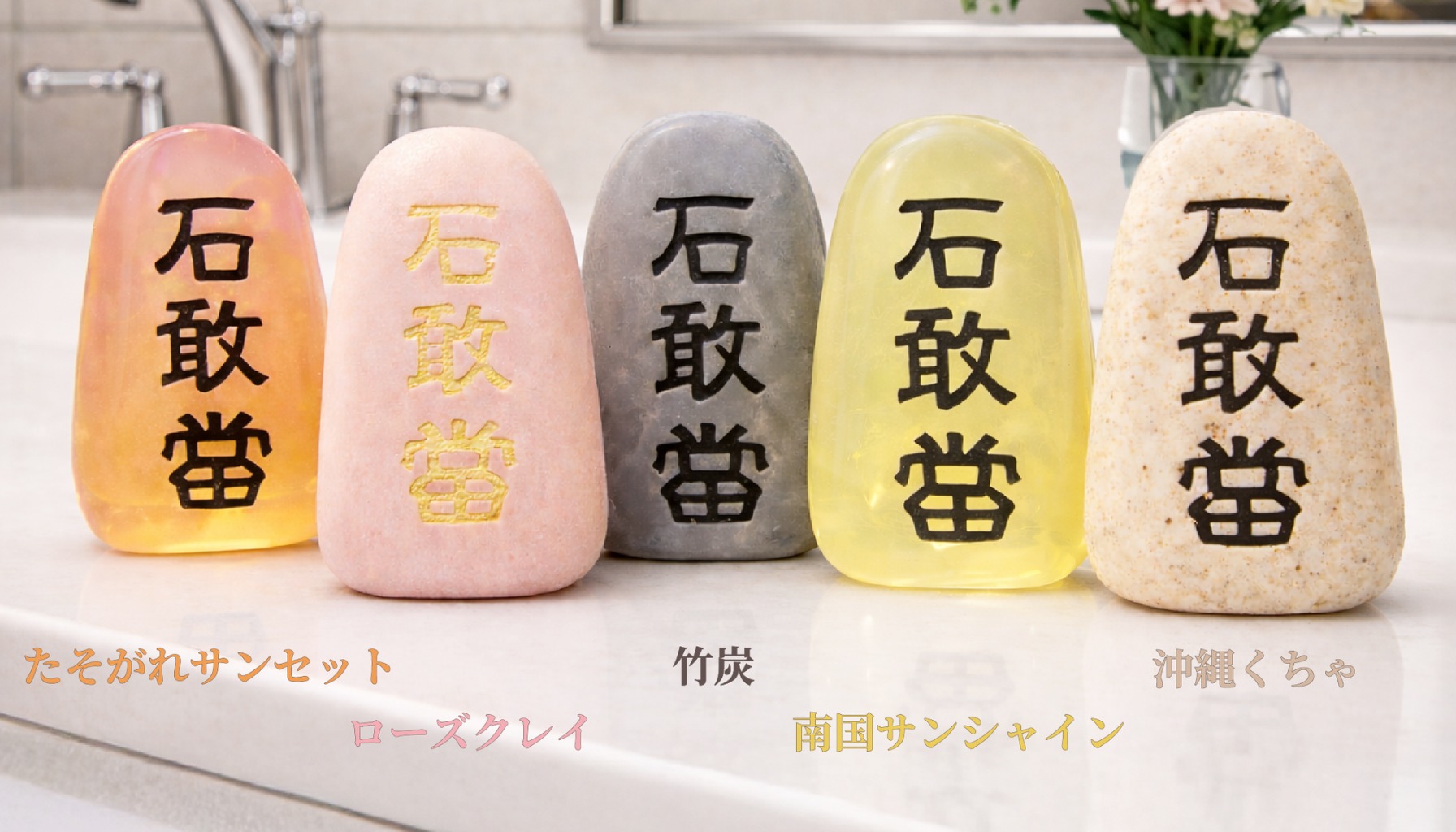 沖縄の守り石「石敢當」をモチーフに、カイコの繭成分から抽出される高保湿成分の恵みを融合させた手作り石けんです。